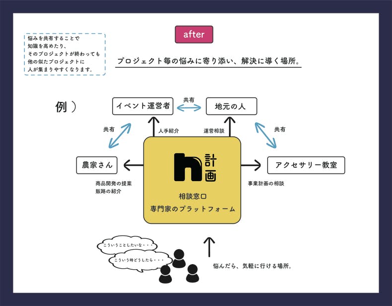 この専門家のプラットフォーム機能が付いていることで、「相談窓口機能」と「悩みの共有化」を解決し、気軽に相談しながら、チャレンジを後押ししてくれる場所にしていきます。