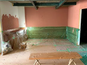 今回は床と壁の木部分をサンダーという機械で、塗装剥がし、その後綺麗に塗装します!