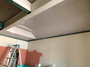 天井のハリ部分を塗装し始めてます。壁は珪藻土が足りなかったので、ちょっと保留。