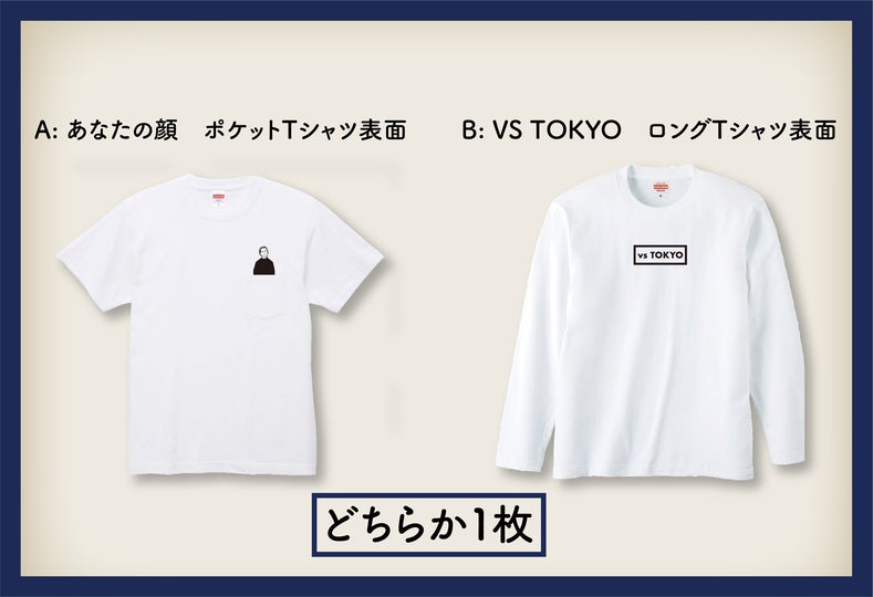 5,000円以上ご支援していただくと、「A:あなたの顔 ポケットTシャツ」と「B: vsTOKYO ロングTシャツ」のどちらか1枚をお送りさせていただきます。