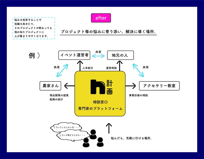 この専門家のプラットフォーム機能が付いていることで、「相談窓口機能」と「悩みの共有化」を解決し、気軽に相談しながら、チャレンジを後押ししてくれる場所にしていきます。
