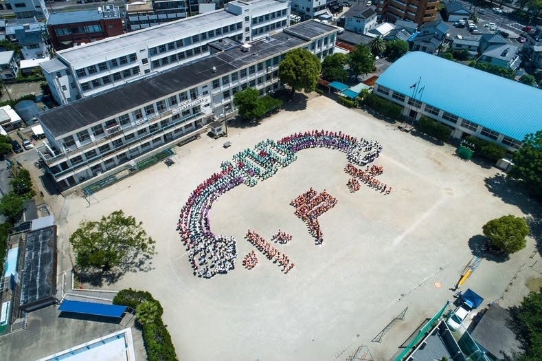 今年5月には『過去から未来への虹の架け橋』をモチーフに、児童・卒業生・地域の方々みんなで運動場に集合し文字を描きました。そしてドローンを飛ばしてついに、世代を超えた1000人参加の航空写真撮影を成功させることができました!!