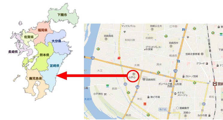 住所:宮崎市立小戸小学校 宮崎県宮崎市大工1丁目5番43号