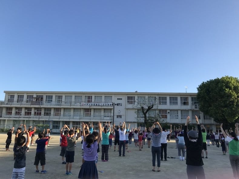 ▲夏休み恒例のラジオ体操(この日は各地区の参加者が小学校に集合)
