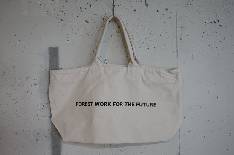 ③「FOREST WORKS FOR THE FUTURE」のロゴが入った、特製トートーバッグをお送りします。林業推し・山師推しの方にはたまらないメッセージプリント。山でも街でも使えるお洒落なデザインで、山師も納得の大容量!大き目トートーバッグです。チャック付き内ポケット付きでとっても便利!