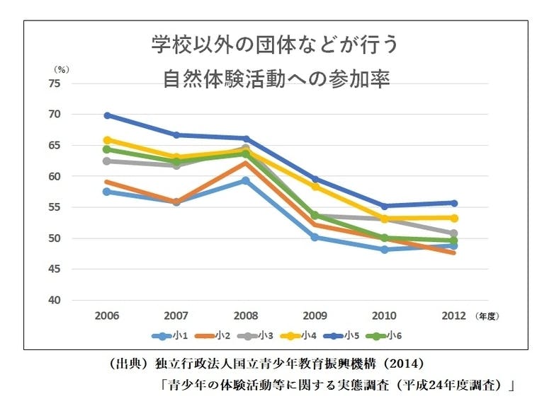 『学校以外の団体などが行う自然体験活動への参加率は,低下傾向。』『自然体験活動についてみると,学校以外の公的機関や民間団体が行う自然体験活動への小学生の参加率は,どの学年でもおおむね低下しており,特に小学校4~6年生は平成18(2006)年度から平成24(2012)年度にかけて10%ポイント以上低下している』と書かれています。
