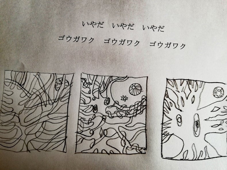 先日、楽画鬼とスカットリンダは、図工の先生として、地元の美咲中央小学校の1年生の授業にお呼ばれしました。プライバシー何とかかんとかのため、授業や作品の画像が公開出来ないのが残念! すっごくステキな絵本が3時間くらいで出来たのです!小学校内の図書室に展示してあるから見に行って欲しいくらい! 画像は画鬼のイメージ文とリンダのラフ画です。 (実際の文章とは異なります。) まず38人が「森」チーム、「星」チーム、「手」チーム、「岩ゴロゴロ」チーム、の4チームに別れて、100×70cm程度の模造紙に絵を描きます。 1チーム9人位、皆で真剣に話し合ったり、「赤塗りたい人!!」「はーい!!」「何で勝手にそこ塗るん!!」「先生ちゃうクセに命令せんといて!!」等々、パワー全開な世界が繰り広げられていて、見ていて笑いっぱなしでした。 絵が出来たら、習いたてのひらがなと漢字で短い文章も書きます。一文字、一文字、交代で書く姿も一生懸命で可愛過ぎ! 最後はジャバラに組み立てたダンボールに木工用ボンドで貼り付けました。校長先生、教頭先生方にもお手伝いして頂きました。とても大きな、床に置いて展示出来る、世界で1冊の絵本が3時間で完成しました。すっごーく素敵な時間でした!