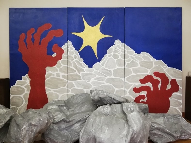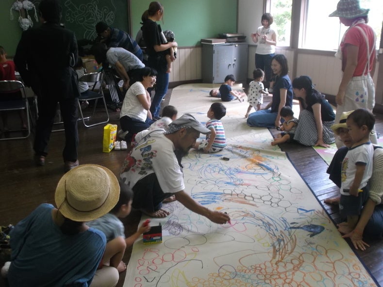 ↓「美咲芸術世界2017」で実施された舞台美術ワークショップ。子供たちが描いた絵が舞台装飾となった。