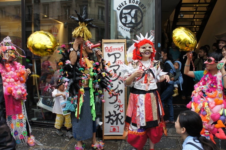 ↓美咲芸術世界2018春のプレオープニングイベントとして、パリの中心部にあるアートスペース「59リヴォリ」で岡山県内作家たちが建物壁面を飾り、「アマンジャクの旅」と題したアートパフォーマンスを披露した。