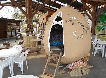 ↓たまごかけごはん食堂前の日本人作家によるタマゴアート作品。