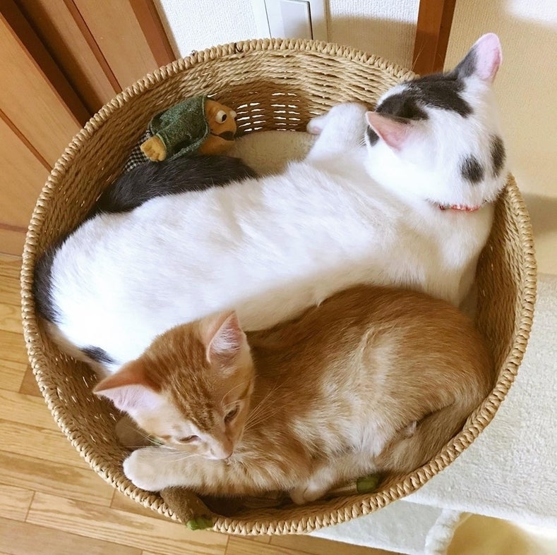 白い方がまめもち。茶トラの方がきなこもちという名前の白石家の猫です。