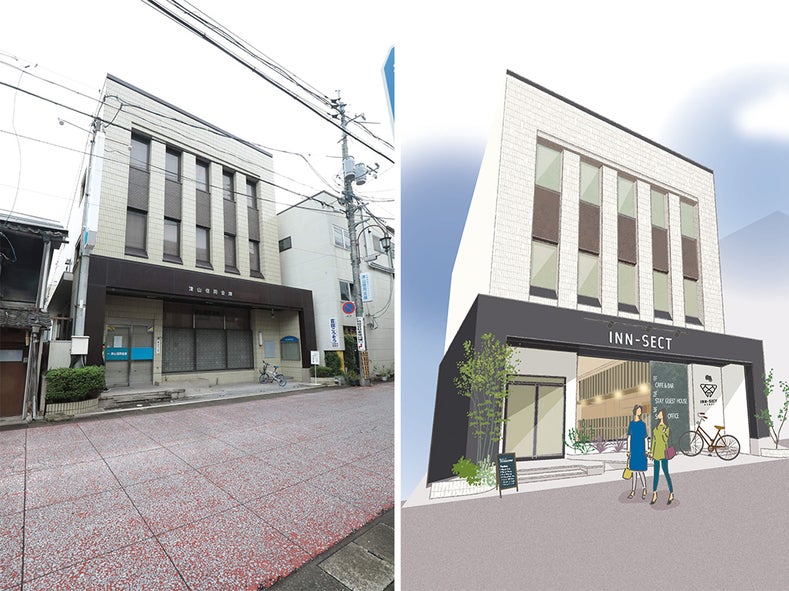 ▼左:津山信用金庫中央支店ビル跡地 / 右:リノベーション後の「INN-SECT」イメージ