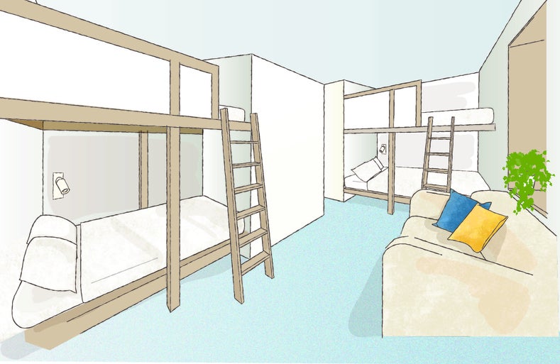 ドミトリー(二段ベッド)、キャビン(扉付きのシングルベッド)、プライベートルーム(4人まで宿泊できる個室)の3パターンからお選びいただけますので、シーンにあわせてお好きなお部屋にご宿泊ください。