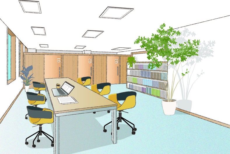 集中したいときはプライベート空間の個室(イラスト奥)、広々とした空間で仕事をしたいときは手前のオープンスペースをご利用ください。また、パーテーションもご用意しておりますので、簡単なミーティングスペースとしてもお使いいただけます。