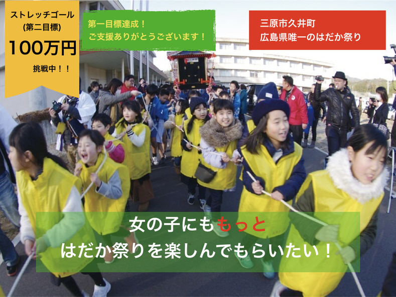 101年の歴史あるはだか祭りですが、これまでは大人の男性しか参加できませんでした。昨今、日本の他地域の例にもれず久井町でも少子高齢化が進み、はだか祭りの出場者も年々減っており、将来的には開催ができなくなるのではないかと心配しています。そこで、子供たちにも一緒に楽しんでもらい、祭りを守っていきたいという有志の強い思いが集まり、2016年より子供たちが参加できる子供はだか祭りが始まりました。いまだにお祭りは男性の物という意識は根強いと思いますが、子供たちには男女関係なく楽しんでもらいたいという気持ちで女の子が参加できるようにしています。しかし、一度に全てを整えることはできず、手探りで作り上げている状態です。現在、男の子の衣装やお神輿は借り物で、女の子の衣装に至ってはイベントのスタッフジャンパーのようなウィンドブレーカーを羽織るだけです。