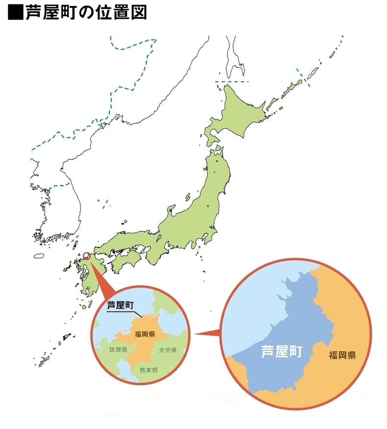芦屋町は福岡県北部に位置する人口約1.4万人の小さな町で、東を北九州市に隣接し、響灘を望む遠賀川の河口に広がり、町制120周年を超える歴史のある町です。
