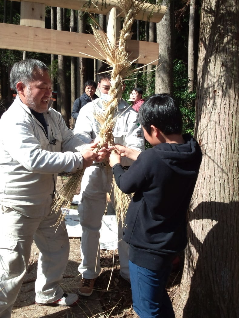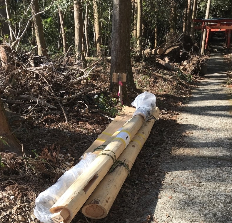今日は、3月4日の初午祭を控えて、夏田山扇森稲荷神社の、新しい鳥居立ての日でした。長くなりますが、読んでいただけたら、幸いです。9時に集合し、弘子さんが挨拶、みんな自己紹介をして、始まりました。鳥居建ては、力仕事なので男性陣が、参道、本殿のお掃除は女性陣がしました。いよいよ、鳥居建てが始まりました。一本目の鳥居は、弘子さんが記録のために、写真撮影をして下さいました。それから、上に上がっていた女性陣に、弘子さんから、「珍しい作業だから、見に来て下さい」と連絡が来て、みんなで、下に下りました。ちょうど、2本目の鳥居を、組み立てている最中でした。金槌や木槌を使って、組み立てていました。バラバラの鳥居がぴったり、納まりました。それからロープをかけて引っ張って、立たせて、鳥居の足を穴に入れて、倒れないように、頑丈に埋めました。見事に、しっかり、鳥居が立ち上がりました。鳥居が立ったところで、しめ縄作りをしました。木の枝にロープをひっかけて、その一報の端に、藁を結びつけて、神社の神主さんで市会議員の松田さんが、藁を渡しながら、福ちゃんの高校の後輩の児玉さんと息子さんと児玉さんの中学生の息子君のお友達(地元)のお友達が、藁で縄をよりました。男の子は、中学校でラグビーをやっていて、「よいさー!」を声をかけながら、縄をねじりながら、よりました。児玉さんの奥さまと私が、ロープを引っ張り、しめ縄を引っ張りあげながら、男性陣がよりました。それから、縄は網目から藁が飛び出ているので、児玉さんの奥さまと私が、ハサミとカッターで、はみ出している部分をカットして行きました。「やはり、こういう作業は男性がするという決まりがあるんですか?」と記者さんが、松田さんに聞いたら、松田さんが「神事は男がすると言われていたけど、今は女の人にも手伝ってもらいます」と答えていました。一方、立てられた鳥居に、朱色のペンキを塗りました。大人が塗っていたら、児玉さんの小学生のお嬢さんが、「ペンキが塗りたい!」と言って、お手伝いをしてくれました。児玉さんに聞くと、「娘は、ああいうことが好きで、器用なんです」と仰っていました。とても上手に塗ってくれました。今日は、風も無く、日差しが熱いくらいで、汗が流れました。上着を着ていた人は上着を脱ぎました。今日は、福ちゃんの後輩やお知り合いとボランティアで、手作りの鳥居を2本立てましたが、後クラウドファンディングでご支援の申し込みのあった鳥居4本は、宮大工さんが立てます。昨日、サンフランシスコから、鳥居の申し込みがあり、急遽福ちゃんに連絡しましたが、初午祭までには間に合わないので、3月中には立てます、ということで、予定地に、目印の札を立てました。インターネットって、クラウドファンディングって、すごいなぁ、とびっくりしました。作業はまだ続いていましたが、弘子さんと私とみよさんは、時間が来たので、引き上げました。鳥居立ての中心になって下さった松井さん、松田さん、山添さん、福ちゃんの後輩の児玉さんファミリー、友達くん、石橋さん、鳥居立てのために、南阿蘇経由福岡から来て下さった了戒さん、大畑さん、みよさん、永山さんご夫妻、福ちゃん、みぃちゃん、お母さん、弘子さん、ありがとうございました。沢山のボランティアの皆さんに参加していただき、感謝です。取材に来て下さった、ワイワイテレビさん、UMKさん、夕刊デイリーさん、ありがとうございました。生まれて初めての、鳥居立てという、貴重な経験をさせていただきました。ありがとうございました。皆さん、初午祭に、みんなで力を合わせて立てた、朱色に輝くピカピカの手作りの鳥居を見に来て下さい!