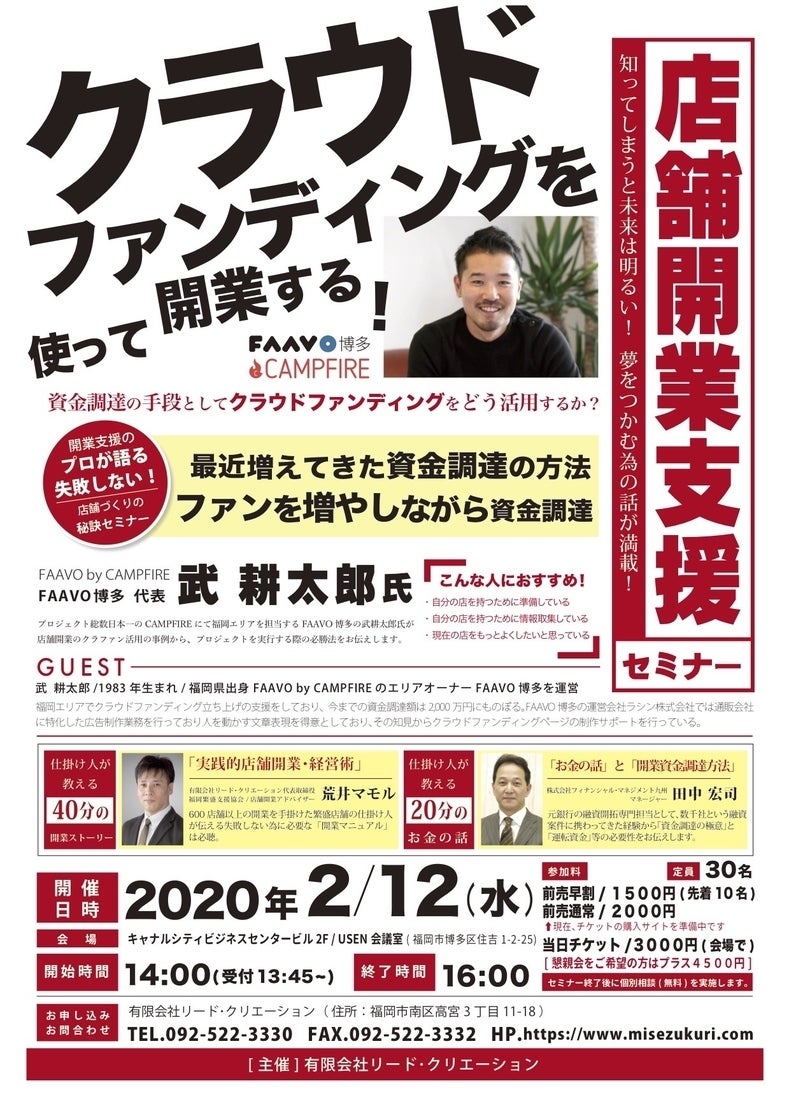 「開業 + クラウドファンディングのセミナー」などはまだあまりありませんので是非この機会にご自身の事業の為にお話を聞いて実践して頂けると良いかと思います。 当然、我々も全面的にバックアップ致します。