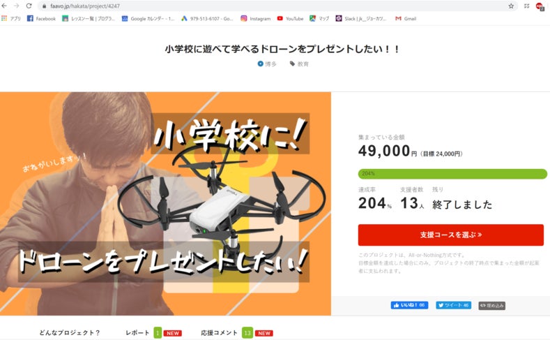 私の「小学校にドローンをプレゼントしたい!」というクラウドファンディング