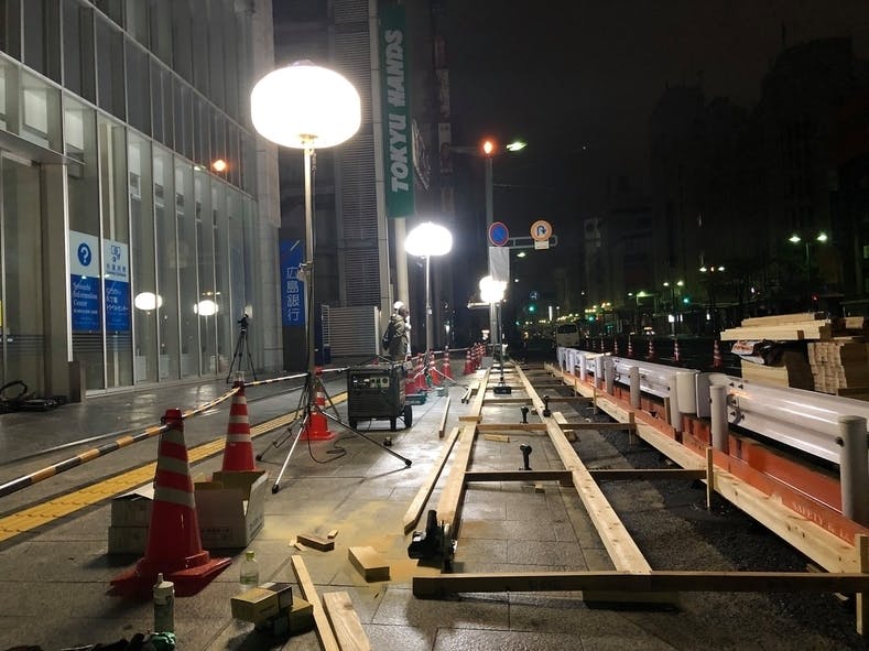 23時の最終バスの通過後、今回施工を担っていただく、安藤ハザマさんによる作業がスタート。