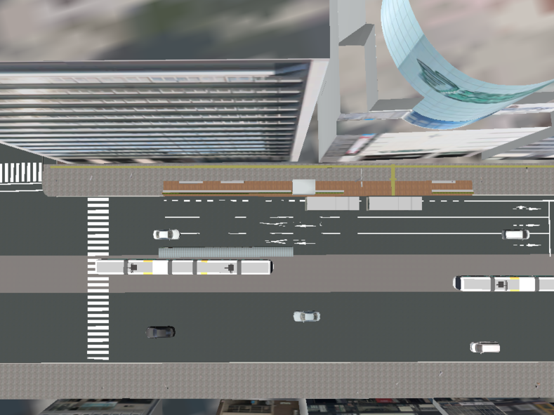 当初は第1車線(歩道からいちばん近い車線)も使用することを検討していましたが、関係機関との協議を経ながら、今回の社会実験ではバスベイ(バス停部分の切り込み)およびトラックベイのみを使用して効果を検証することになりました。中央にコンテナ店舗を設置し、その左側(西側)が滞留空間、右側(東側)がバス待ち空間として整備されます。