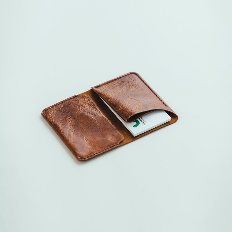 一枚革で名刺を包むような作り。中は3分割して自分用、サッと入れる用、保管用と分けることができる。自分の名刺は20枚ほど収納。名刺が左に入っているのが左利き用。
