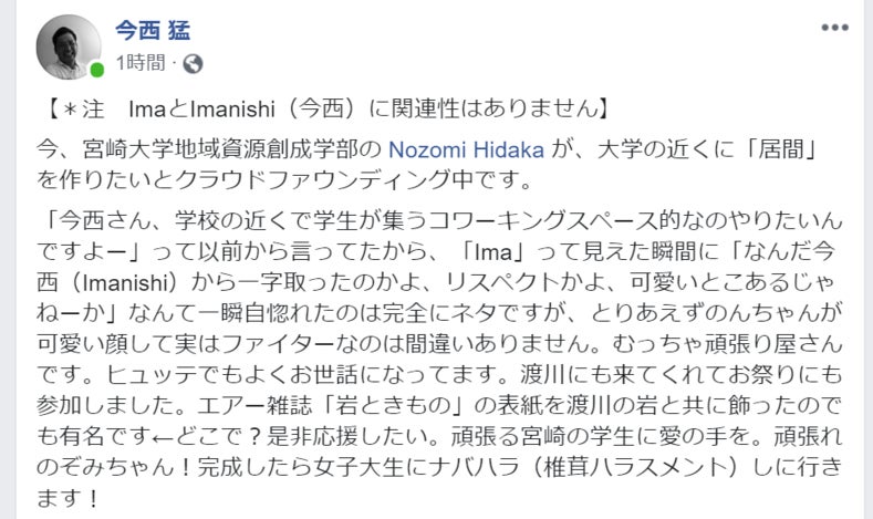 山師兼株式会社HUTTE代表取締役のImanishiさんから 応援メッセージをいただきました! 山師であり、株式会社HUTTE代表取締役の今西猛さんから応援メッセージをいただきました!!!ありがとうございます! 私はとても今西さんを尊敬していて、トップオブ大好きな大人の中の一人です!いつもお話すると、こちらまでどきどきわくわくしてくるパワーと熱い情熱と愛を持っている人です! 株式会社HUTTEは街中でカフェ&コワーキングスペース「若草HUTTE&co-ba Miyazaki」を経営しています!ぜひ街中に行った時には寄ってみてください!↓ https://www.facebook.com/wakakusahutte/ ーーーーーーーーーーーーーーーーーーーーーーーーーーーーー 【*注 ImaとImanishi(今西)に関連性はありません】 今、宮崎大学地域資源創成学部の Nozomi Hidaka が、大学の近くに「居間」を作りたいとクラウドファウンディング中です。 「今西さん、学校の近くで学生が集うコワーキングスペース的なのやりたいんですよー」って以前から言ってたから、「Ima」って見えた瞬間に「なんだ今西(Imanishi)から一字取ったのかよ、リスペクトかよ、可愛いとこあるじゃねーか」なんて一瞬自惚れたのは完全にネタですが、とりあえずのんちゃんが可愛い顔して実はファイターなのは間違いありません。むっちゃ頑張り屋さんです。ヒュッテでもよくお世話になってます。渡川にも来てくれてお祭りにも参加しました。エアー雑誌「岩ときもの」の表紙を渡川の岩と共に飾ったのでも有名です←どこで?是非応援したい。頑張る宮崎の学生に愛の手を。頑張れのぞみちゃん!完成したら女子大生にナバハラ(椎茸ハラスメント)しに行きます! ↓以下本文↓ 渡川でのお祭りの時の写真↓ 破壊的笑顔ですね。もう少し口を閉じて笑いたいと思います。笑 エアー雑誌「岩ときもの」の撮影会の様子↓ いやあ、これの反響すごかったな←いやだからどこで? また、渡川にもHUTTEにも行きます! メッセージありがとうございました!