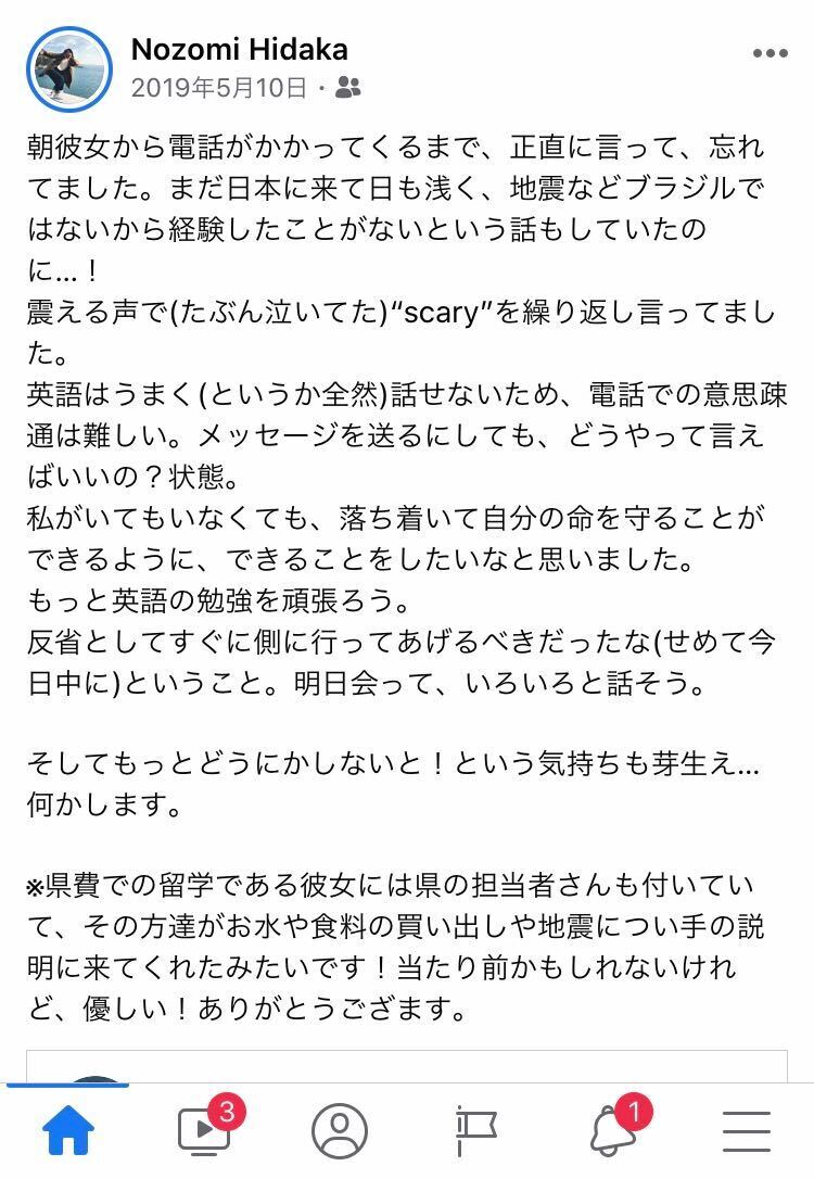 14時46分に宮崎でサイレンは鳴らない テレビで見た、非現実的な出来事。あの黒く大きな激しい津波に襲われ、大切な人を失った、大切な場所が姿を変えた日。“被災地”になってしまった場所。 私はどこか遠い国の出来事に感じていたけれど、そこに自分の足で立ち、そこに暮らす人々と過ごし、3.11をその地で迎えると、考え方や意識が変わりました。 ープロジェクトページの本文より 昨日は3月11日。14時46分にゼミ室で友人と一緒に黙祷をしました。 ラジオから聞こえてくるサイレンが宮崎では鳴らないことを初めて知りました。 宮崎では、南海トラフ巨大地震が30年以内に26%以上の確立で起こるとされています。 発生すると、私が住んでいる宮崎市や実家のある都農町は、震度7の地震が起き、15m以上の津波が起こると予想されています。 2019年の5月、インターンから戻って、「コミュニティカフェやっちゃいなよ」とゼミの先生から言われた後、宮崎で地震が起こりました。私はその頃、留学生のチューター(お世話係)をやっていました。少し大きめの地震で、私も「これ大きいのがまた来るかもしれない」と、不安になっていた時に、留学生の彼女から電話がかかってきました。震える声で”scary”(怖い)と繰り返す彼女に、私は英語が全然出てこなくて、大丈夫しか言えませんでした。 日本に来て日が浅い彼女にとっては地震の時の対応はわからないし、気にかけてくれる人も頼れる人も少ない。そもそも地震というものを体験したことがない。地震から自分の身を守る術を知らないのです。 ※実際のFacebookの投稿↓ - でもこれって、留学生の彼女だけですか? 宮崎に住む人の何人が、ハザードマップを見たことがありますか?自分の地域の避難場所を知っていますか?自分の家の海抜を知っていますか?家族で集まるときの場所を決めていますか?災害用伝言ダイヤル171を知っていますか? きっと知らない人が大半じゃないでしょうか? 地震や津波といった自然災害から自分を守れるのは自分のみです。 対処方法や逃げ場所を知っていれば、もしもの時に逃げ切れる確率が格段に増します。 そして、 あなたを大切に思っている誰かを悲しませずに済むのです。 体験していなくても、みんな目で見て話を聞いて、頭では理解しているのに、実際に行動に移すのはハードルが高いですよね。 Imaでは、震災や防災といった、自分や家族だけじゃ、考える機会がなかったり、話すのにハードルが高かったりすることも、ゆるく参加できて、まじめに楽しく学んで、深く知ることができる活動をしていきます。また、それが習慣となったり、行動に移したりできるようになることを目的として行いたいと思っています。 それ以外でも、社会課題などの取っ付きにくい課題も、ゆるゆると語り合える場にできたらなと思います。 高校生の頃、ベトナムに研修に行った後の発表会で、世界を変えることができるのです、と言いました。 「意識が変わると行動が変わる。行動が変わると自分が変わる。一人一人が変わっていけば、世界を変えることができると思うのです。」と。 その意識が変わる一歩、一言、一つの経験。そのきっかけが小さな地域の小さな居場所Imaでもたらすことができると信じています。 宮崎で14時46分にサイレンは鳴らなくても、目を瞑って、大切な人や場所を思う時間にする人がいます。石巻で意識が変わった私みたいに。