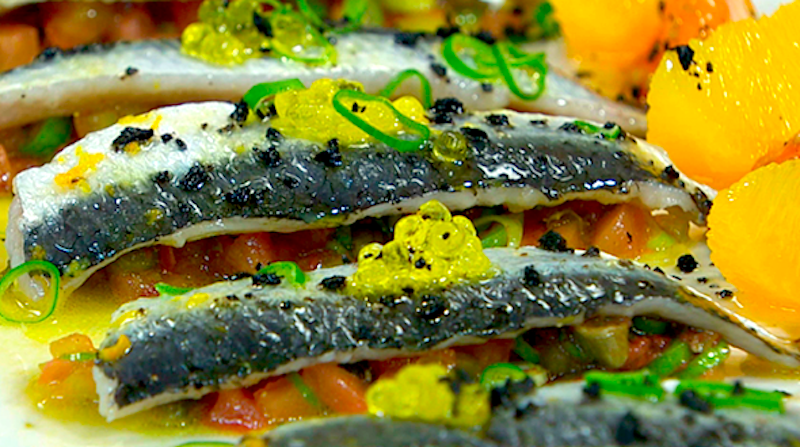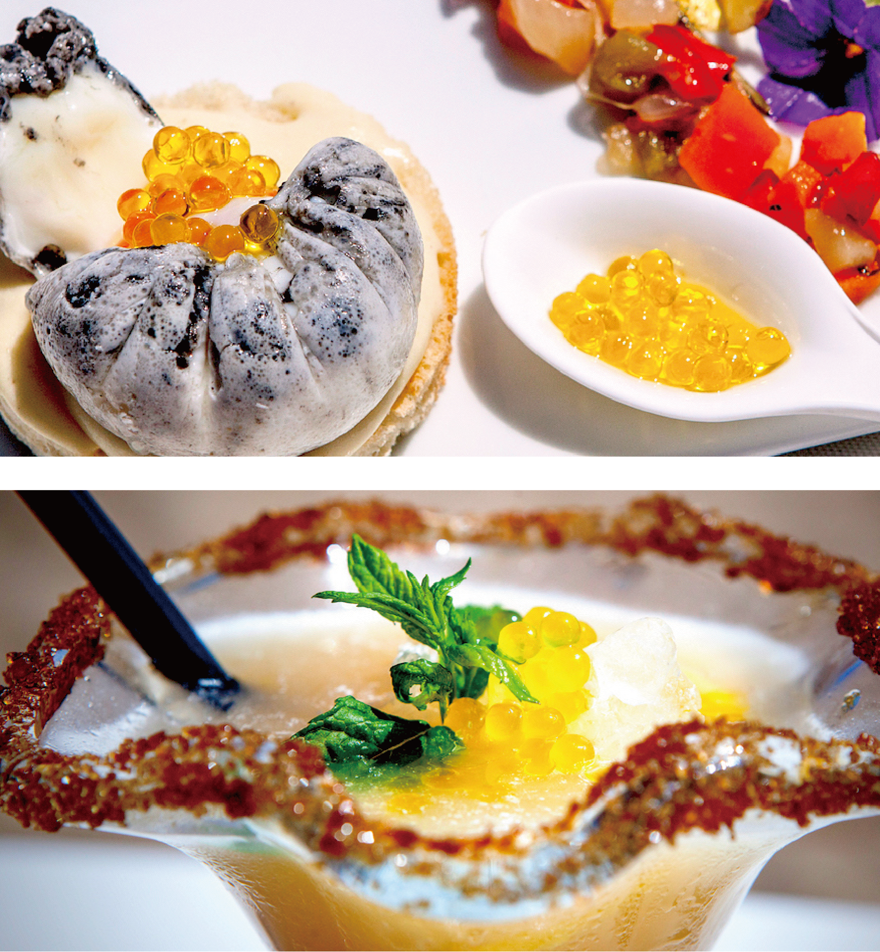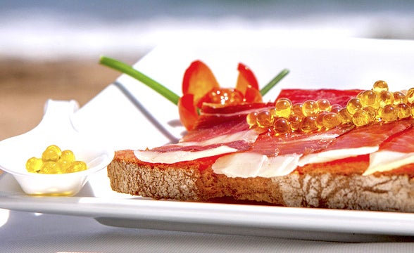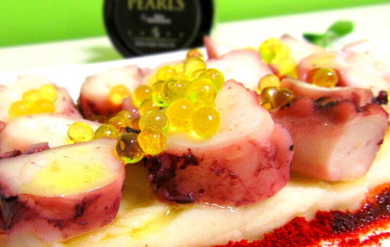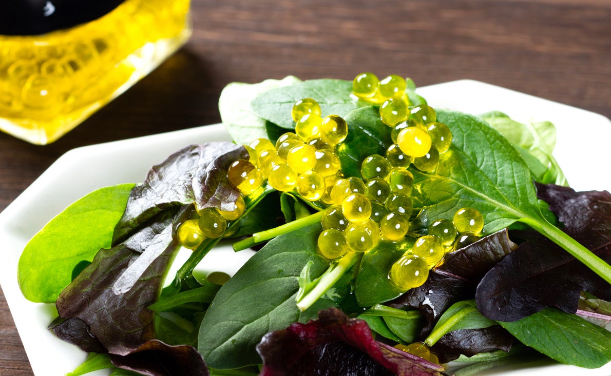 このエクストラヴァージン・オリーブオイルが料理に風味を加えるだけでなく、印象的な食感と美を加えるため球体にしました。球体にすることで、口の中で広がるエクストラヴァージン・オリーブオイルの新しい食感をお楽しみいただけるはずです。