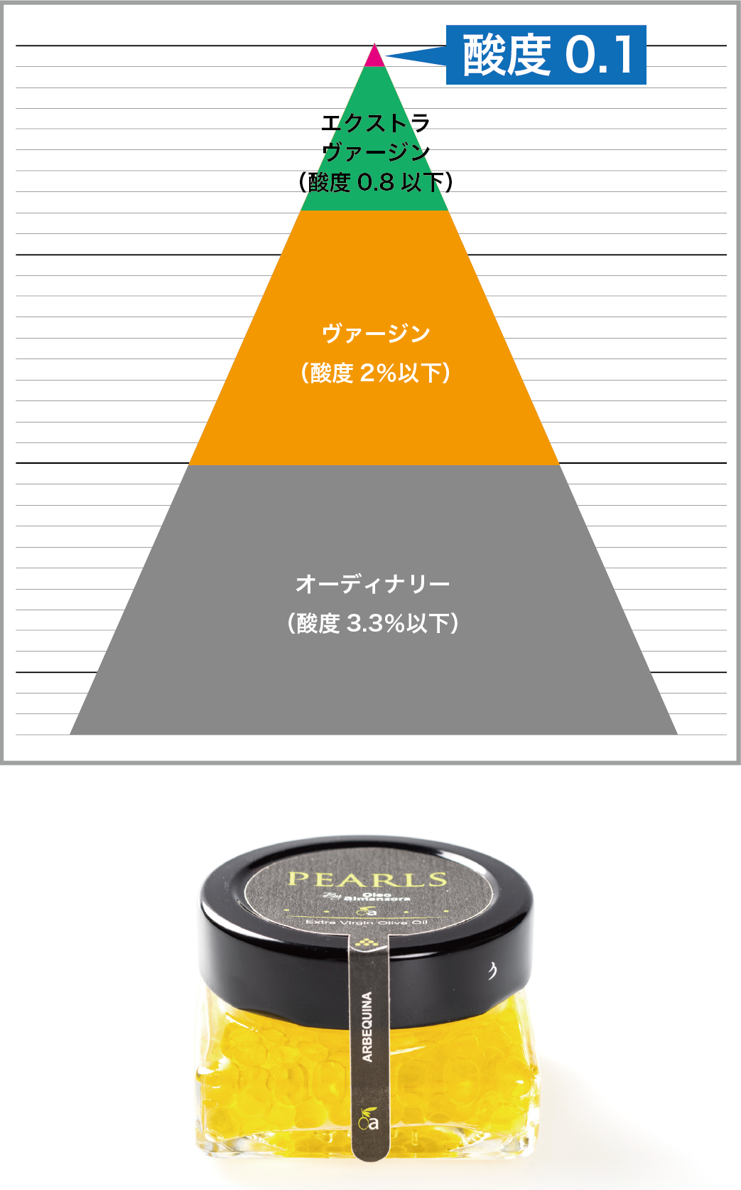 オリーブオイルの鮮度を示す数値は「酸度」で、この酸度が低ければ低いほど品質が高いことを意味します。