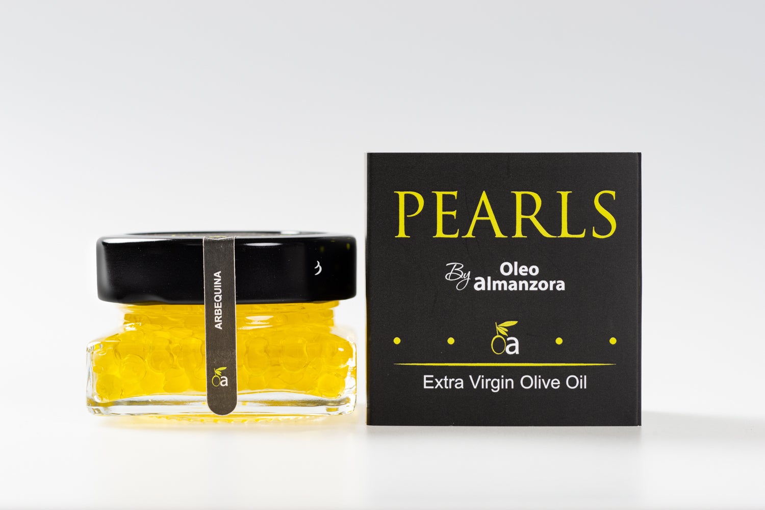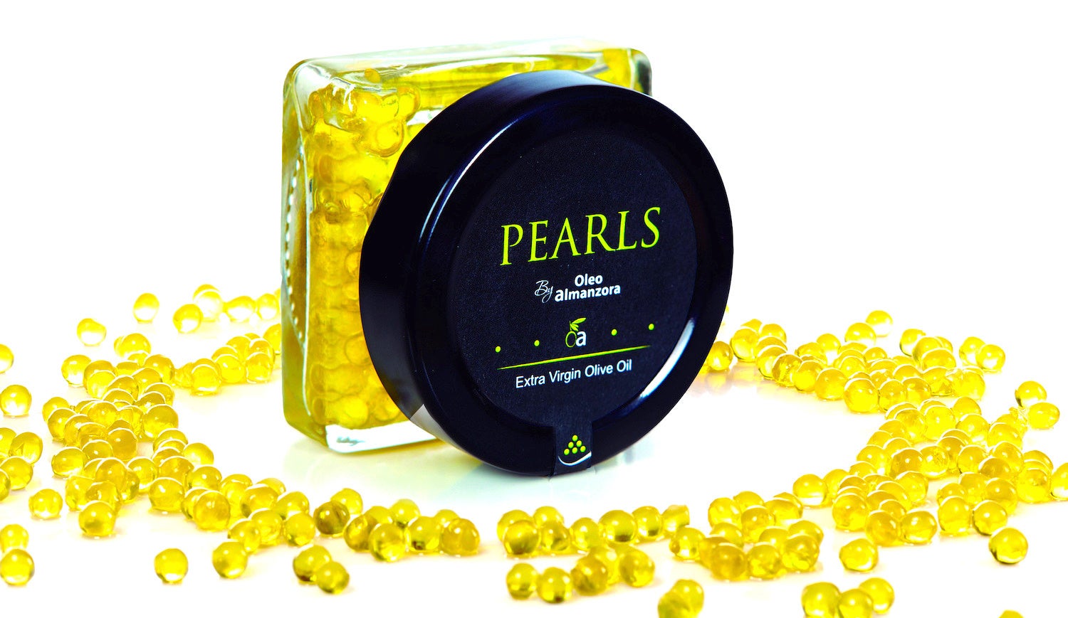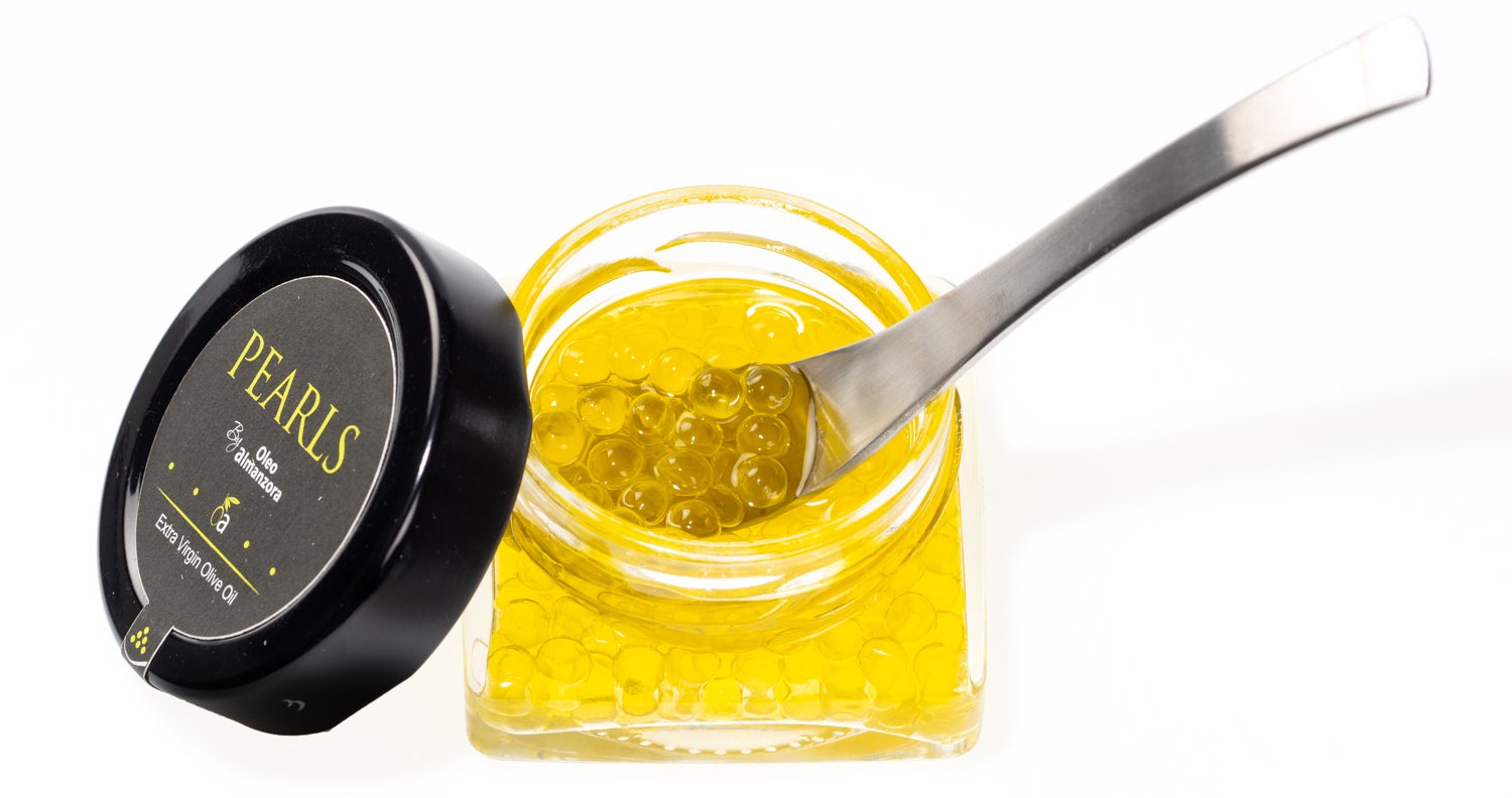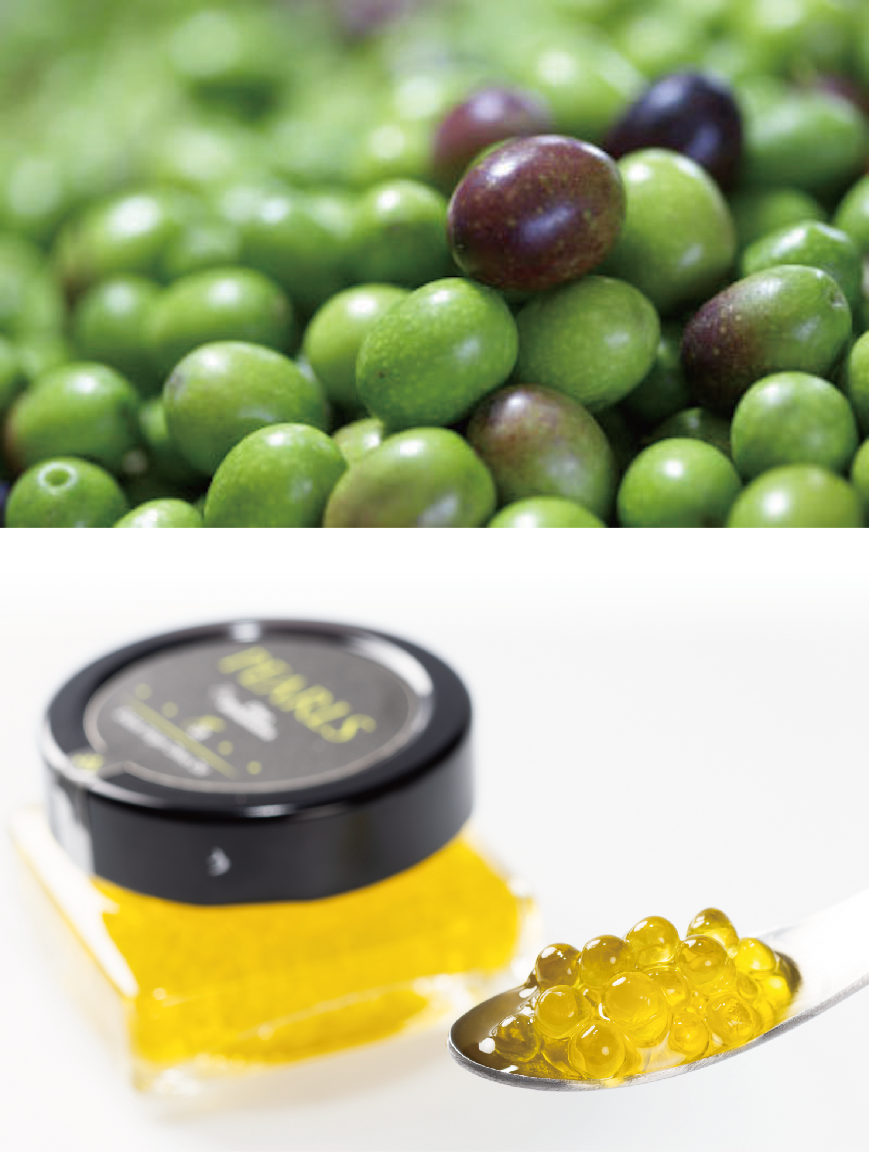 宝石のような輝きの【パールズ・オリーブ】はエクストラヴァージン・オリーブオイルを、海藻から取られた自然由来の食物繊維を使って粒状に仕上げていますので、これまでにない食感とともに爽やかなオリーブの香りが口いっぱいに広がります。