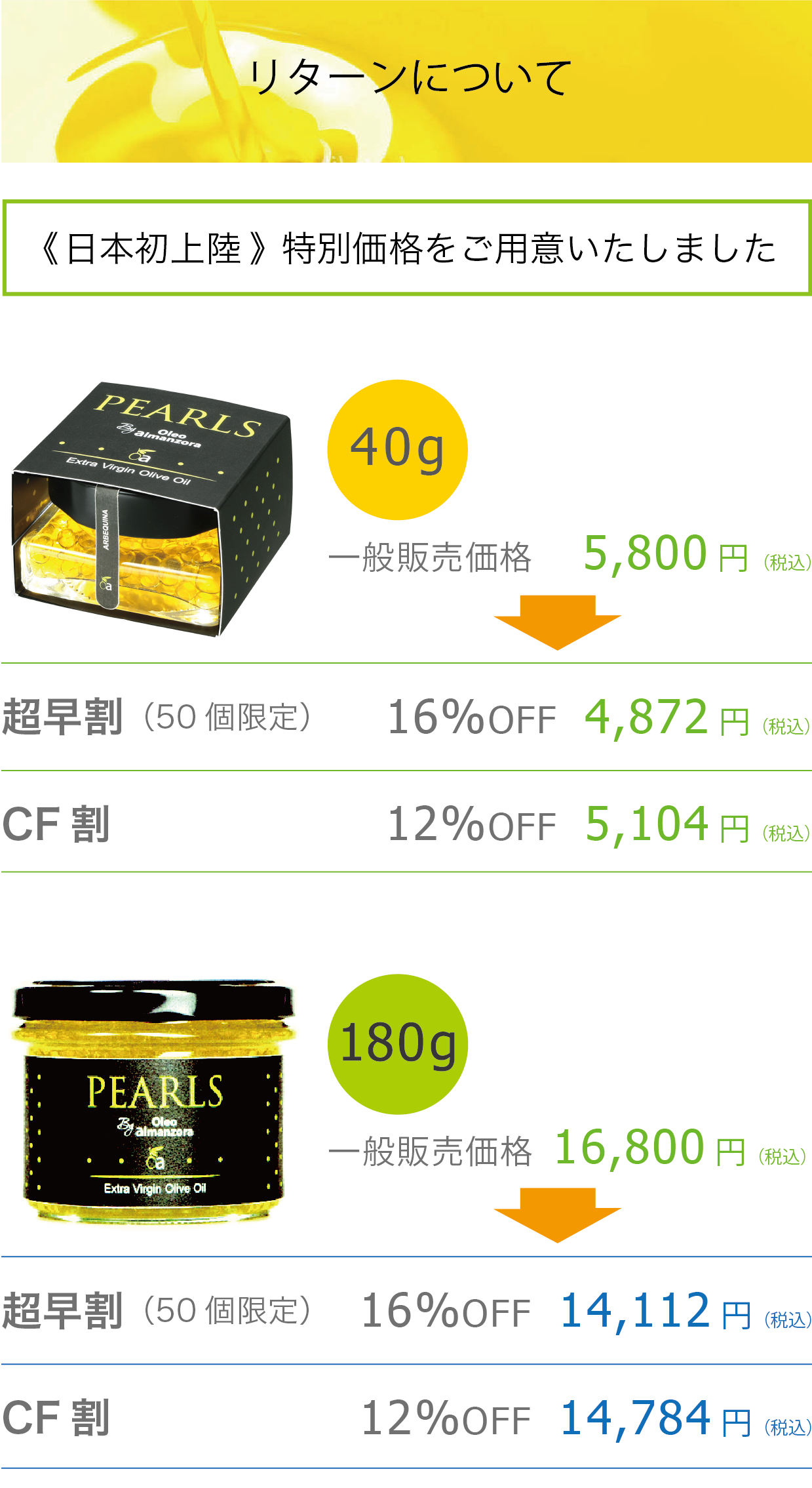 【パールズ・オリーブ】は見た目の美しさもさることながら、食べ物と一緒に口に含んでから絶妙な食感とともにオイルが口に広がるので、これまでにない新鮮な驚きを感じていただけるでしょう。