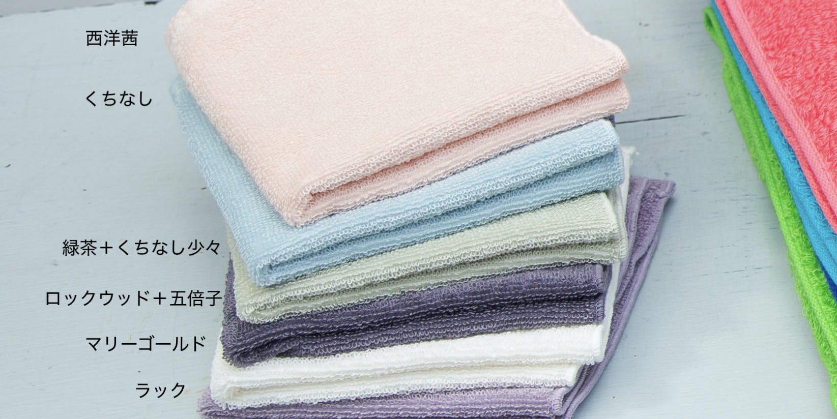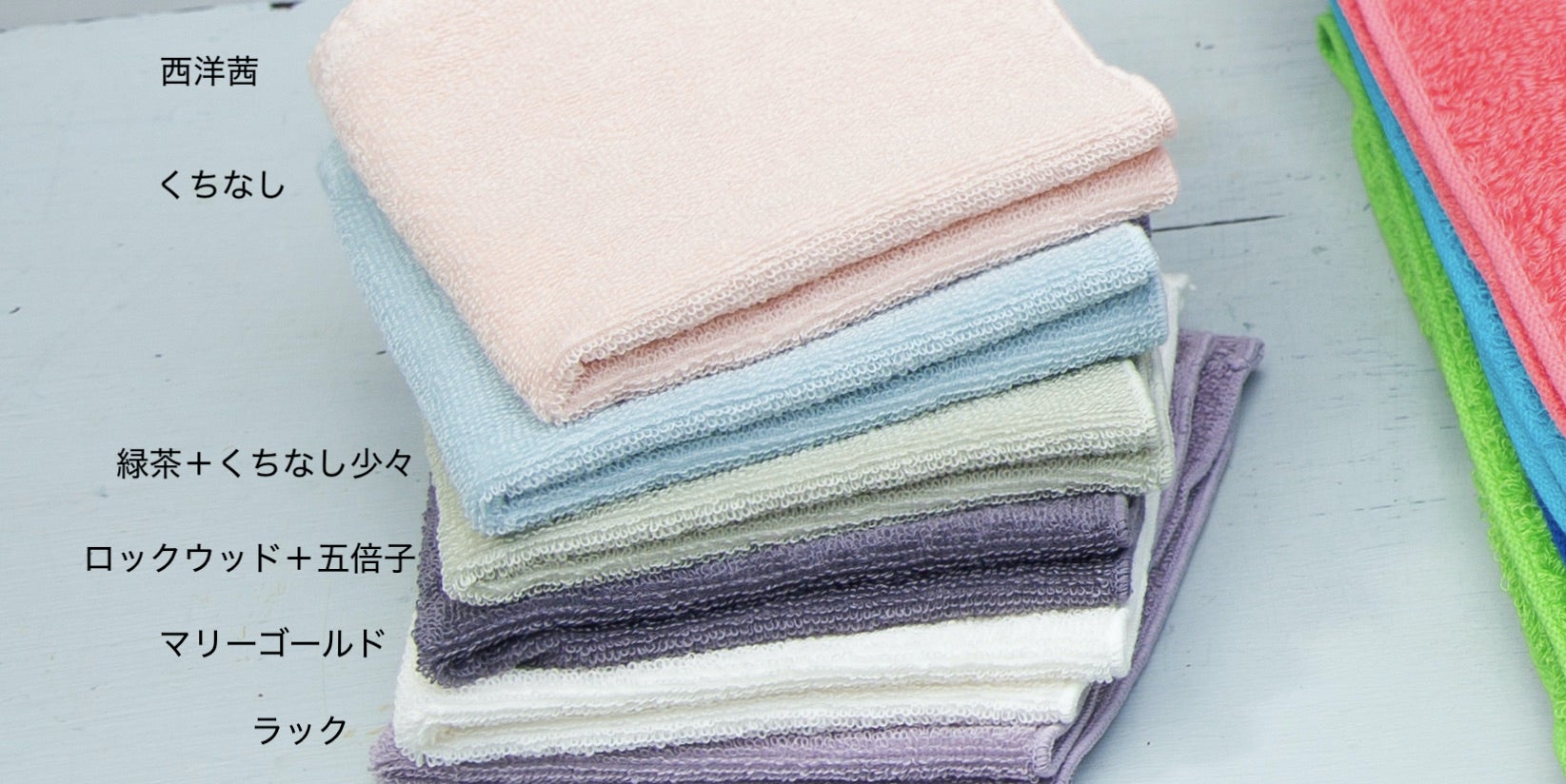 ハンドタオルは草木染めを採用しました。草木染めの染料を独自に組み合わせたり、媒染剤に工夫を施して、通常の草木染めとは一味違うこだわりの色目を仕上がりを実現いたしました。後述しますが、今回のラミーコットンタオルの洗い工程で最後の魔法をかけてくれた河上工芸所の三宅社長の技が冴えわたっています。サイズは27cm×27cm。
