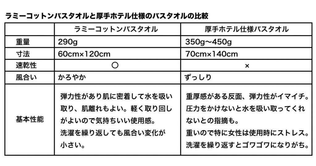 大判、厚手で扱いにストレスがかかることから、バスタオルを使用する人が減っているそうですね。こころばせラミーコットンバスタオルは、従来の高級と称されるバスタオルとの比較を下図にまとめした。軽くて、早く乾き、洗濯に強いタオルです。