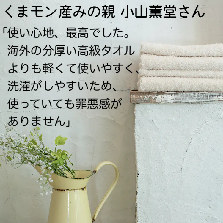 ご使用者のご感想の様に私が独自に開発したラミーコットン糸はとても高い吸水力を持っていますので、お風呂上がりにフェイスタオルでも十分に髪の毛を含めて水分を拭き取れます。