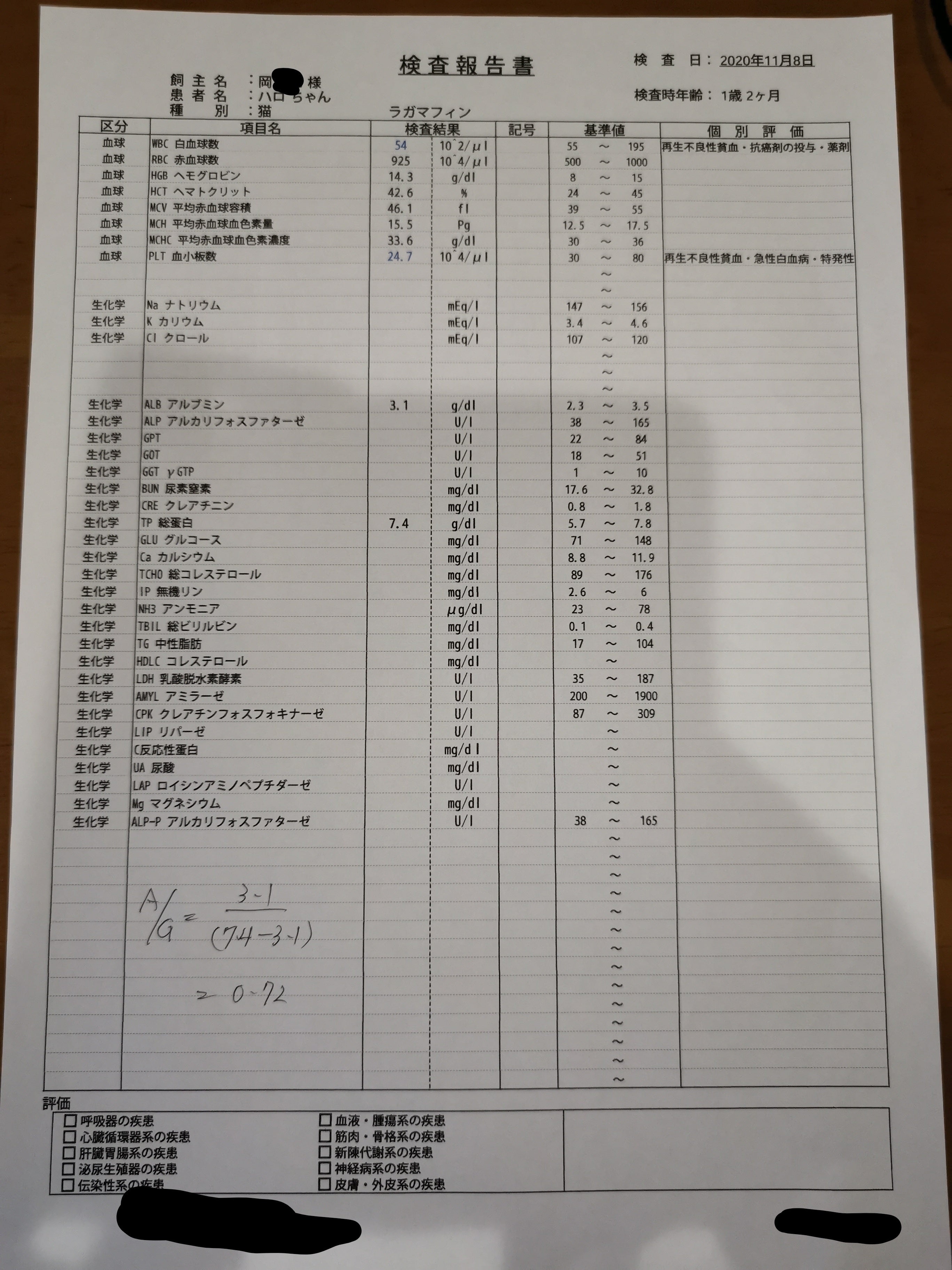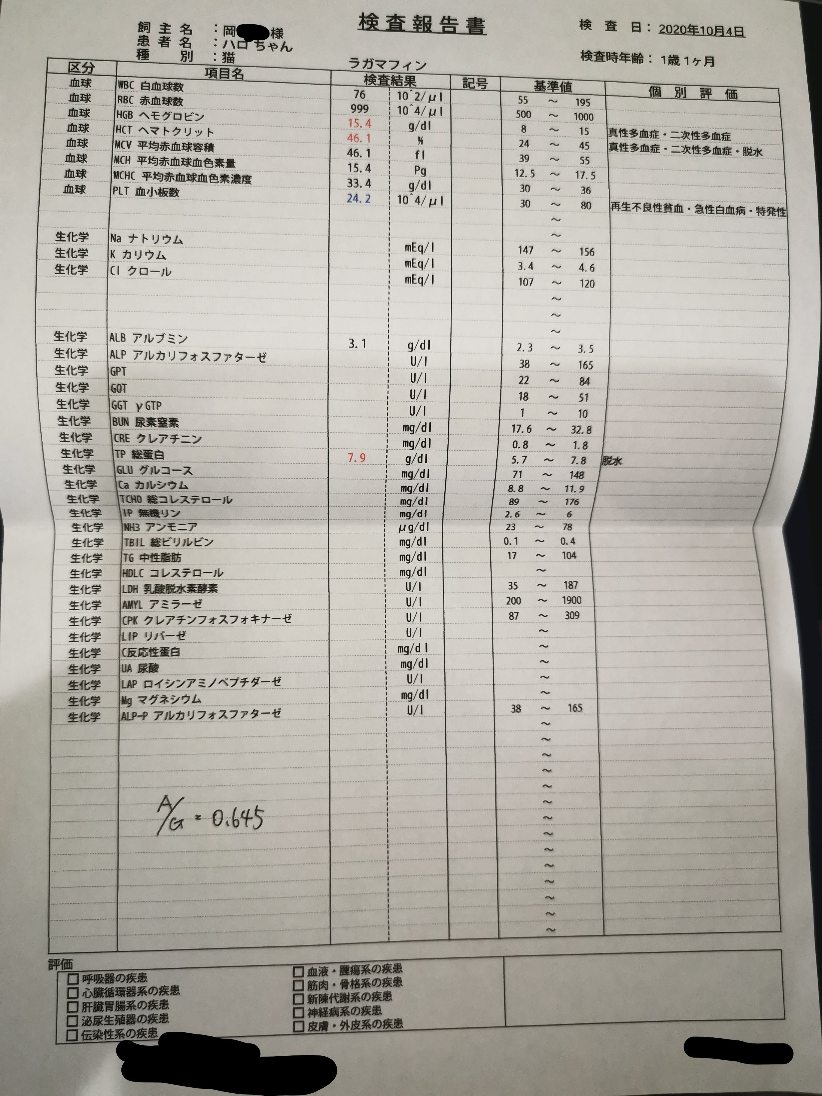 先生からは、もともと健康な子でもA/G比がこのくらいの子もいる。また、食欲等に大きな変化がなければ心配することはないと言っていただきました。