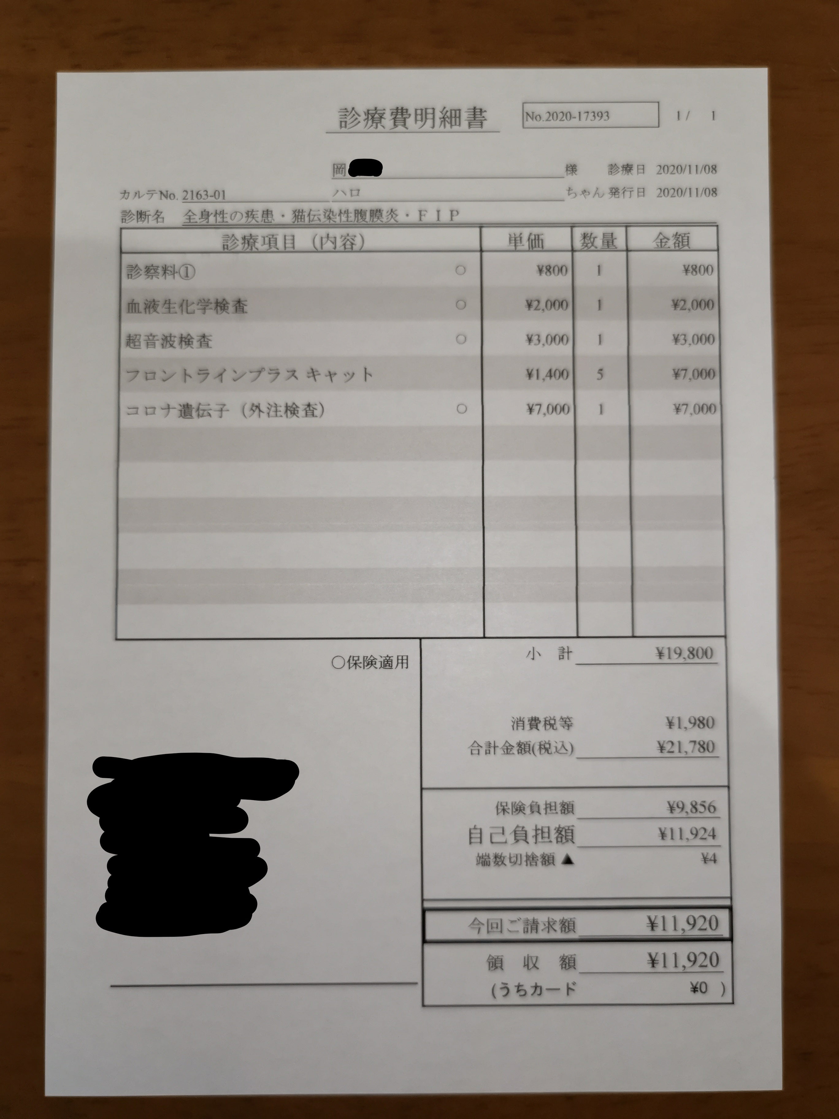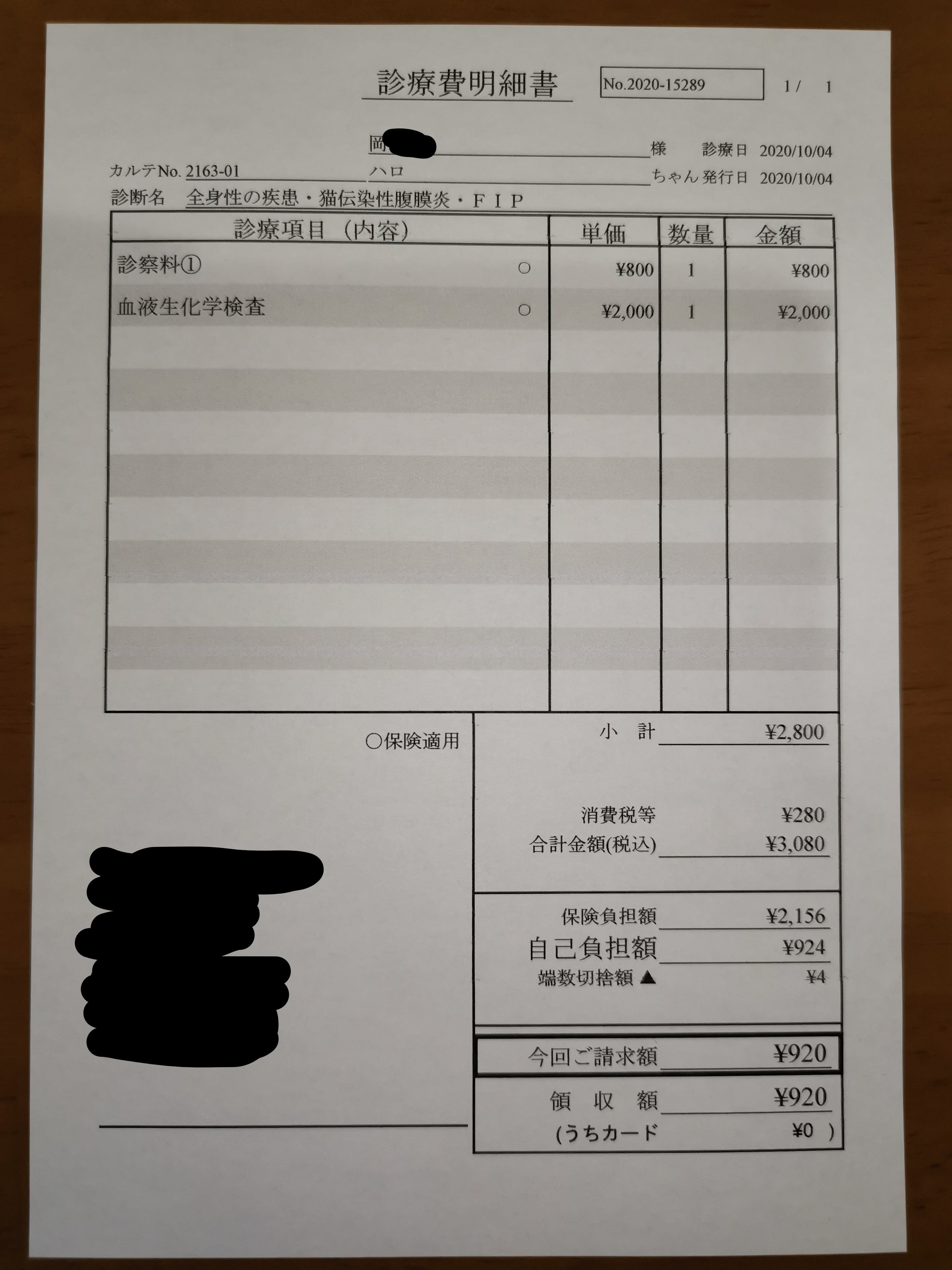 ○10/4にかかった費用 920円(検査費)