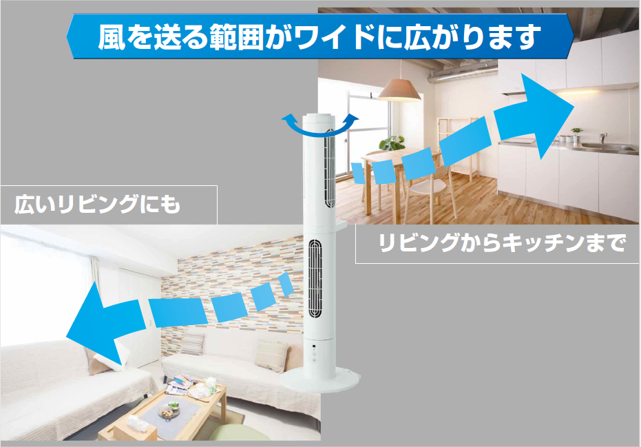 変える事が出来ます。これにより風を送る範囲が広がりますので、広いリビングや