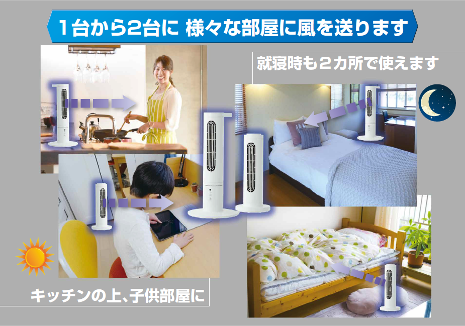 2台のミニファンを使って昼間はキッチンと子供部屋、夜は別々の寝室など複数の部屋に