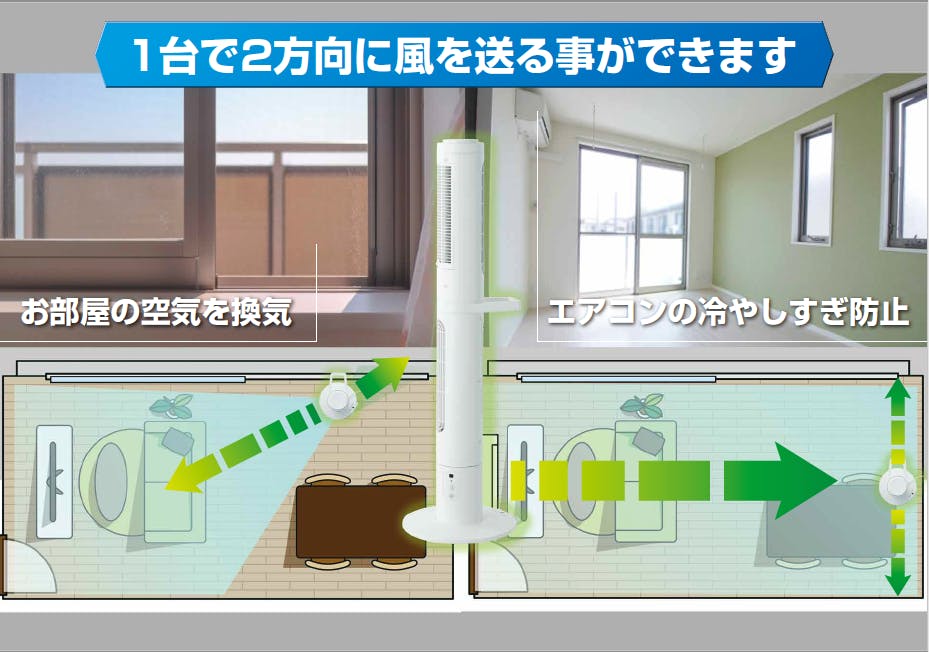 も使えるので、水平から上への風を送る事もできます。洗濯物の乾燥時やエアコンの風も