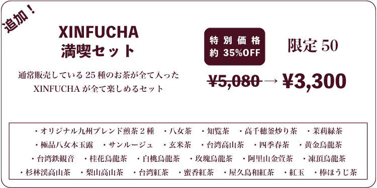 こちらのリターンは、XINFUCHAが通常販売している25種類のお茶のアイテムによりますが4~10g入っている一煎分のパックを全種類セットにした、XINFUCHAのお茶が全部試せるリターンとなっています。