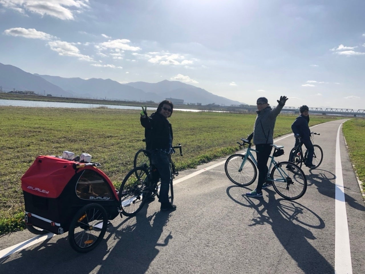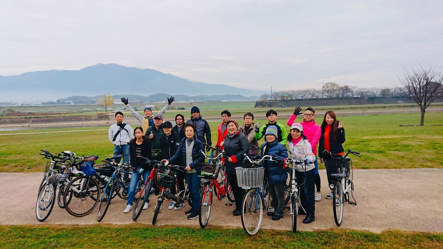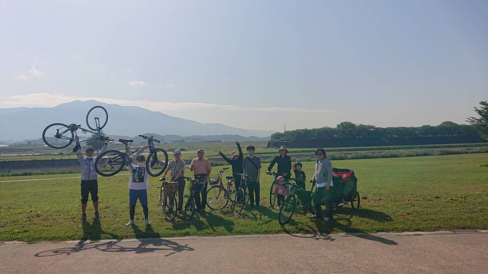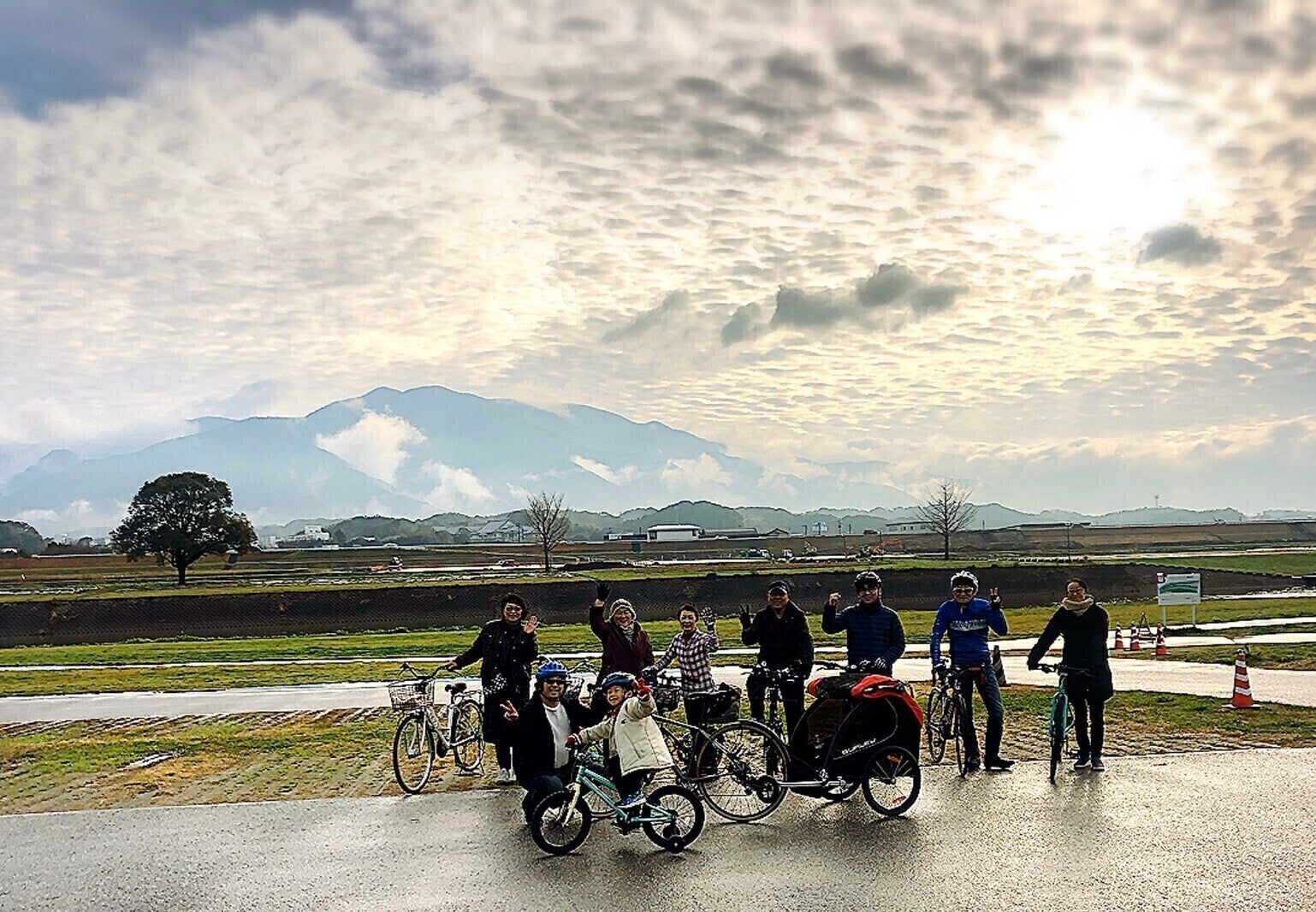 そして昨年、往復70kmのサイクリングロードが開通した事を機に自転車に乗りはじめ、昔を思い出して「復活!おはようサイクリング」を毎月第4日曜日の朝に気の合う仲間達と2019年11月より毎月実施しています。現在地元直方市の方はもとより北九州市など市外からの参加者も多く、上は60代のお姉さまから下は自転車に乗れないけどパパの自転車に牽引してもらいながらの可愛い参加者までが参加してくれるまでになりました。「復活!おはようサイクリング」は徐々に参加者も増え、盛り上がっています。