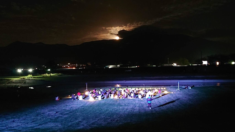 地元の人はよく「田舎は何もないから・・・」と言うけれど、そんなことはありません!福智山の自然や遠賀川の水辺から見る美しい景観…など見てもらいたい資源がたくさんあります!そんな美しい自然が残る魅力ある直方をPRするため、人が集まるイベントがしたい、そんな思いで有志が集まって私たちは「のおがたわくわく実行委員会」を結成。昨年からいくつもイベントを開催しました。2019年10月満月の日には遠賀川河川敷でoffshore styleとコラボした100名の参加者の方と「お月見ヨガ」、