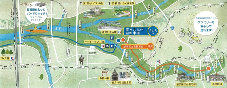 2019年11月,遠賀川河川敷に往復約70kmの『県道直方北九州自転車道線』が開通しました。