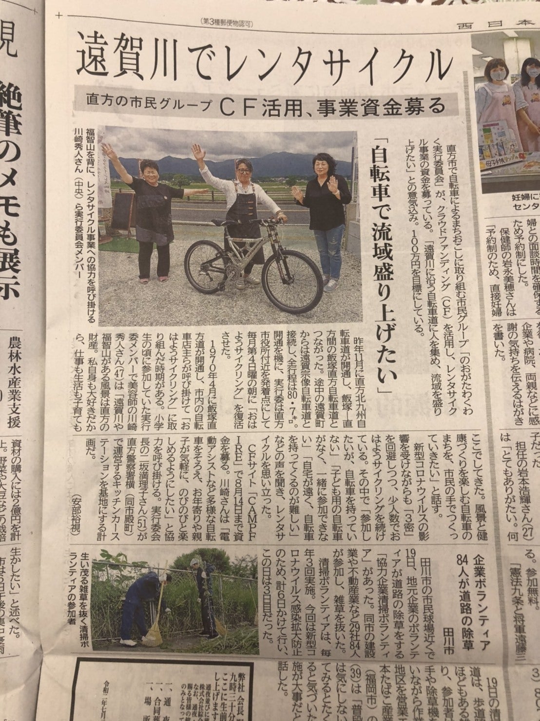 『西日本新聞さんに掲載して頂きました』いつもご支援者ありがとうございます!プロジェクトオーナーの川﨑です。本日の西日本新聞(筑豊版)に私達の活動を掲載して頂きました。ありがとうございます。平素からの皆様のご協力、ご支援に心より感謝申し上げます。この活動はおはようサイクリングにお気軽に参加して頂く為にレンタル自転車を購入するチャレンジですが、こののおがたの景色を満喫して頂きまたそこから繋がる遠賀川流域の世界遺産巡り(中間市、宗像市)コスモス祭り(水巻町)波津海岸(岡垣町)など自転車でもっと素敵発見をして頂き観光スポットに必ずなり街と街を繋ぐツールになると信じて今後も活動して参ります!どうぞ今後共あたたかいご支援の程お願い申し上げます。 のおがたわくわく実行委員会 川﨑秀人