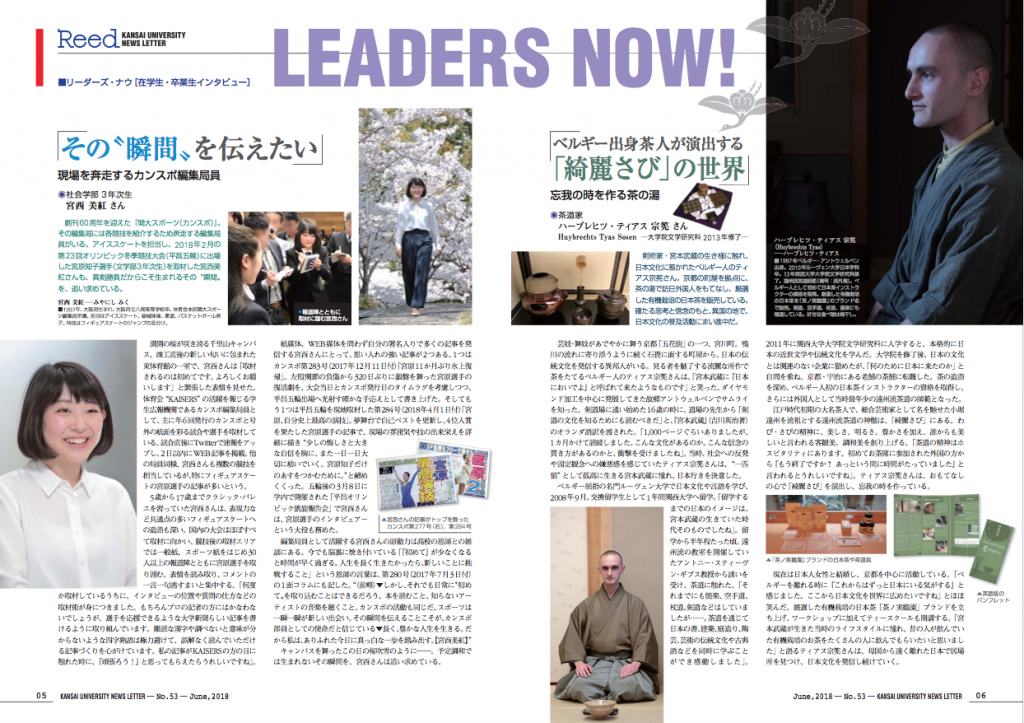 関西大学「リード」に取材いただき、リーダーズ・ナウ「在学生・卒業生インタビュー」と言うコラムに茶人としての活動を取り上げていただきました。