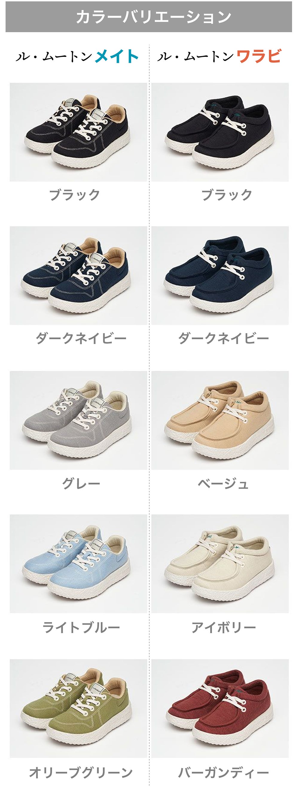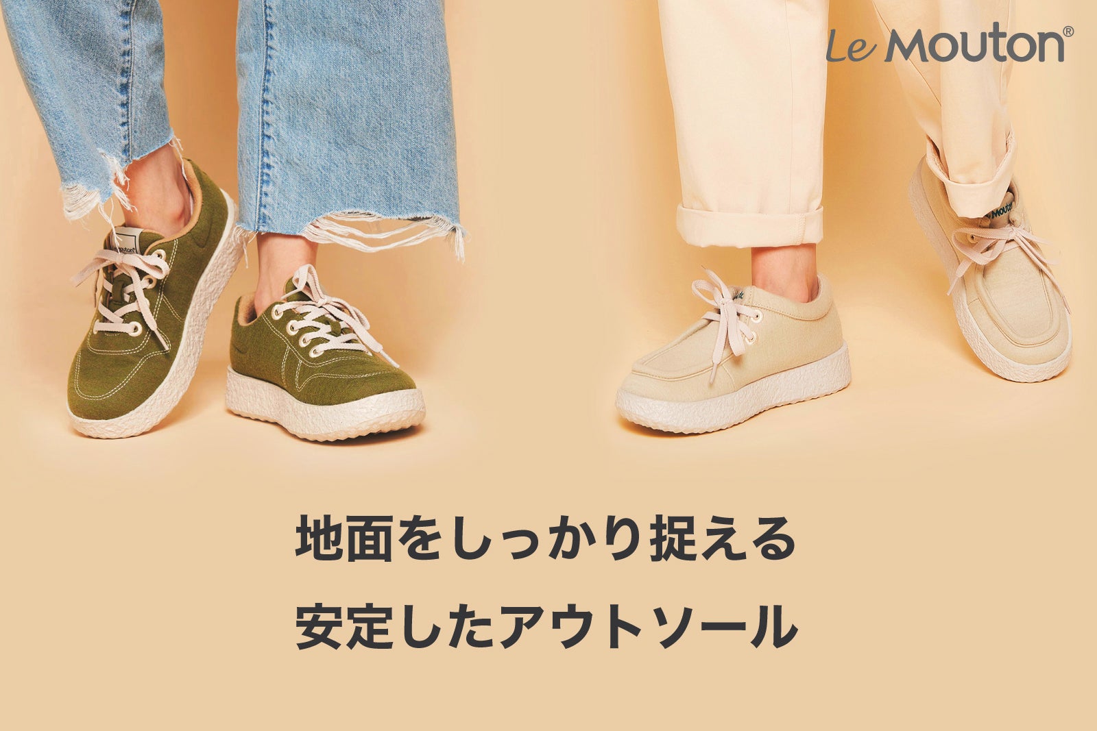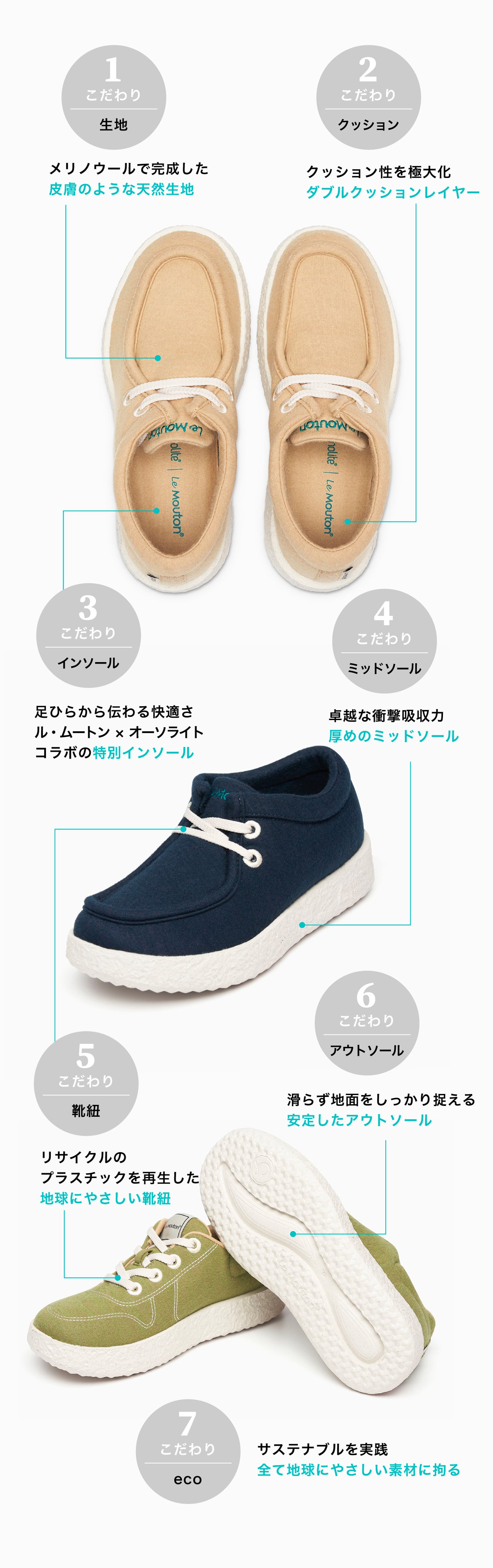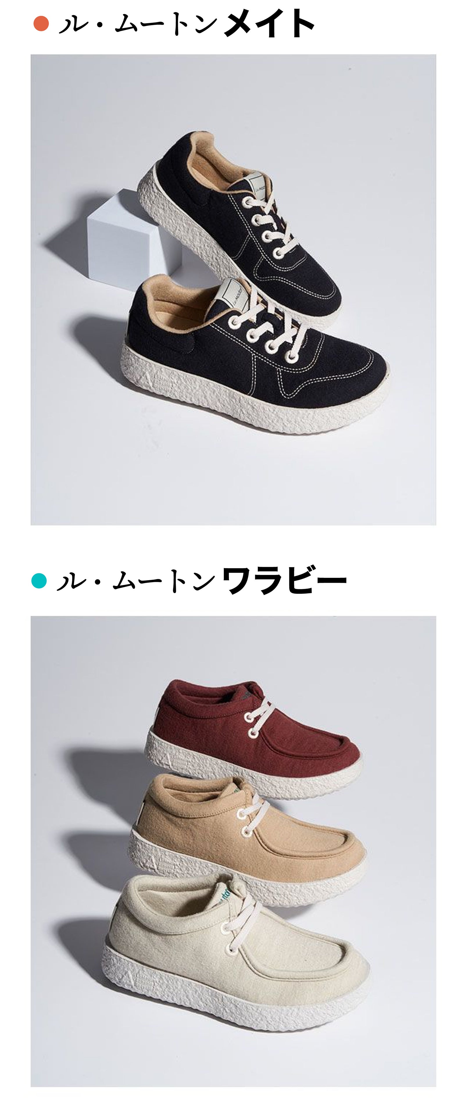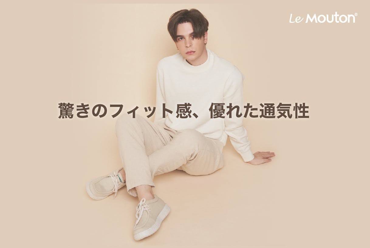 カジュアルすぎずオシャレなデザイン、高級な天然メリノウール素材の「ル・ムトーン」シューズは、履くほど自分の足に馴染んで、自分だけの一足なります。生地やインソール、ミッドソール、アウトソール、靴紐までどれ一つも素材や機能、デザインに拘ってないものはありません。
