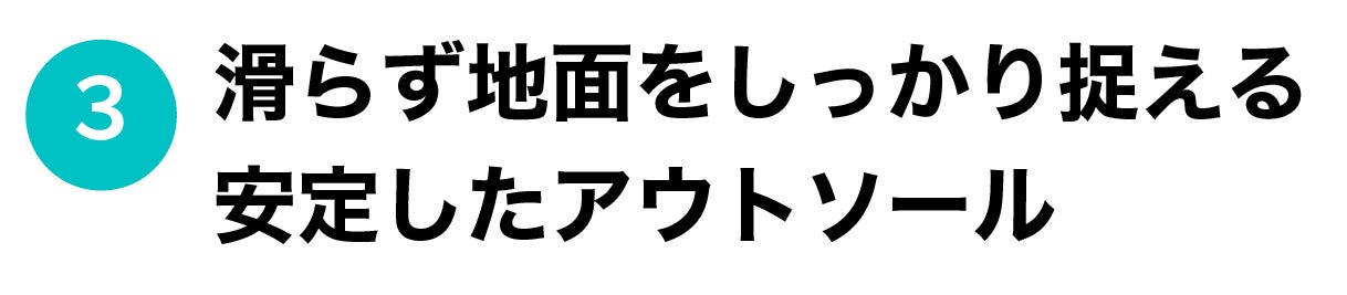アウトソールは摩擦力を高め、どんな状況でも簡単に揺るぎのない安定的な接地力を確保するためにハニカムの六角構造とトライフォードのパターンを採用しています。ハニカム構造は軽くて強度があり体重をしっかりと受け止めることができ、立体感あるトライフォードのパターンを加えることで摩耗に対する耐性が高くしています。
