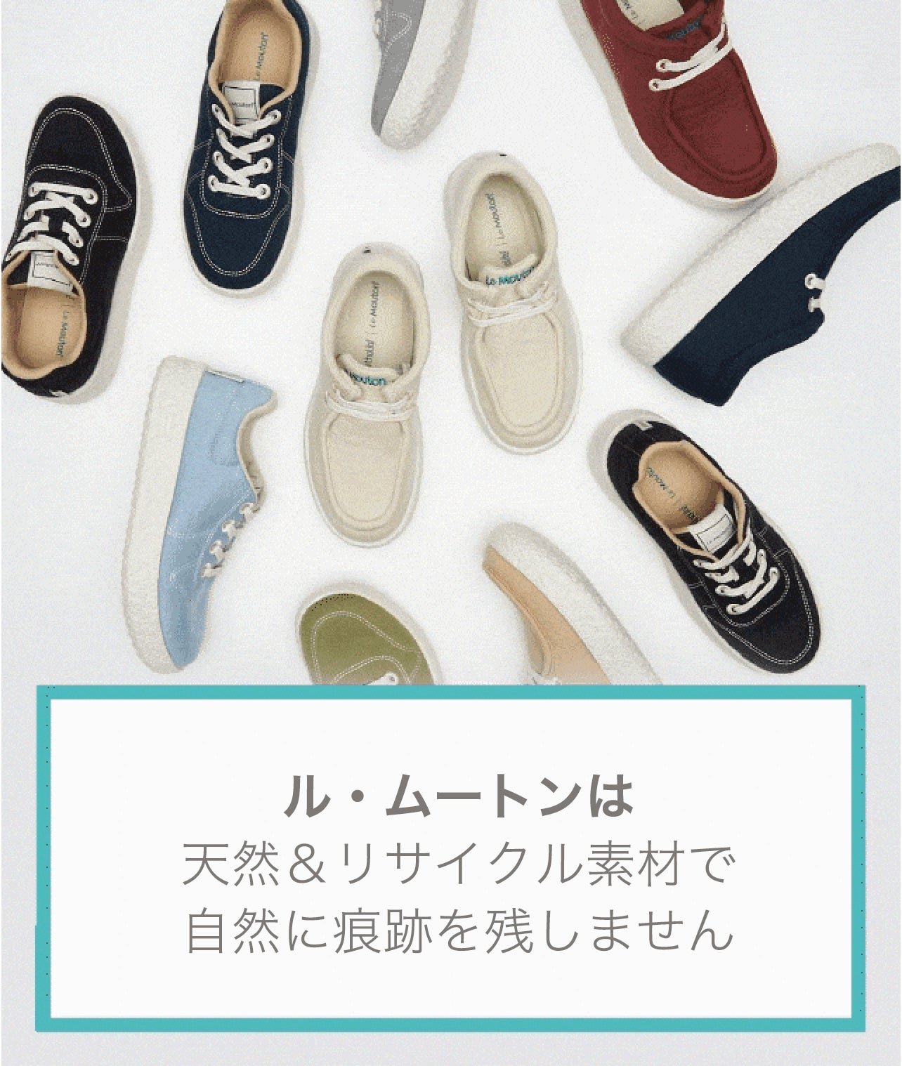 ル・ムートンの靴ひもは、100%リサイクルのポリエステルで作られています。捨てられるプラスチックやペットボトルを大事な再利用資源として使っています。地球に役立つことを皆様と一緒にできればと思います。