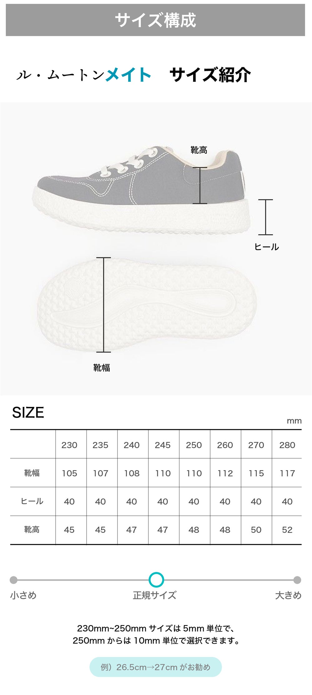 A. 250mmまでは5mm単位で揃ってるのでご使用中のサイズをお勧めしますが、250mm以上のサイズの場合は少し大きめををお勧めします。 (例えば、265mm-> 270mm)